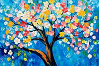 Een bloeiende boom in levendige kleuren danst op een helderblauwe achtergrond. De creatieve penseelstreken en delicate bloemen geven de kamer een vrolijke, uitnodigende sfeer. Dit kunstwerk is perfect voor de woonkamer en brengt frisheid en levensvreugde in elke ruimte waar je wilt ontspannen en genieten.