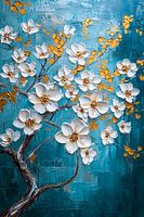 Dit prachtige schilderij toont een bloeiende boom met elegante witte bloesems die subtiel zijn omlijst door takken en gouden accenten. Het diepblauwe achtergrond zorgt voor een rustgevende sfeer, terwijl de goudtinten het geheel een luxueuze uitstraling geven. Het driedimensionale effect van de verfstreken geeft de bloemen een levensechte textuur, waardoor het schilderij als het ware uit het doek springt. Perfect voor in een moderne woonkamer of eetkamer, waar het zowel een rustig als levendig middelpunt kan vormen. Dit kunstwerk straalt een tijdloze schoonheid uit en voegt elegantie en verfijning toe aan elke ruimte.