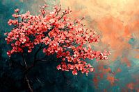 Dit prachtige kunstwerk brengt een serene sfeer in elke ruimte. De subtiele bloesem in zachte roze tinten contrasteert prachtig met de warme oranje en koele blauwgroene achtergrond. Ideaal voor liefhebbers van natuur en elegantie, voegt dit schilderij een verfijnd accent toe aan uw interieur. Perfect voor zowel moderne als klassieke stijlen.