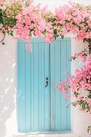 Hier ontvouwt zich een verleidelijk samenspel van zachtblauw en felroze. De delicate houten deur, omringd door weelderige bougainville, nodigt je uit voor een mysterieus avontuur. Bloemblaadjes strelen het koele blauw en creëren een harmonieuze verbinding tussen natuur en architectuur, die zomerdromen en vakantieherinneringen oproept.