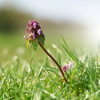 Bloeiende dovenetel, Lamium purpureum, op een groene weide in een natuurreservaat in het Herrenkrug Park bij Magdeburg in Duitsland in het voorjaar