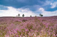 Bloeiende Heideplanten kleuren roze en paars in een heidelandschap in de zomer in het Veluwse natuurgebied tijdens een zomerse dag.