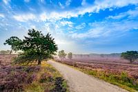 Bloeiende heideplanten in het heidelandschap bij zonsopgang in de zomer met in de verte een wandelpad dat verdwijnt bij de Renderklippen in het Gelderse natuurgebied de Veluwe.