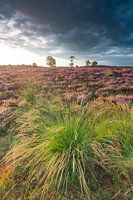 Bloeiende heideplanten in heidelandschap tijdens zonsopgang in de zomer bij Renderklinppe in het natuurgebied de Veluwe in Gelderland.