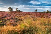 Bloeiende heideplanten in heidelandschap tijdens zonsopgang in de zomer bij Renderklinppe in het natuurgebied de Veluwe in Gelderland.