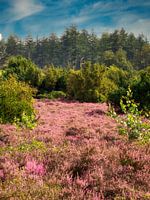 De paarse heide staat prachtig in bloei. Op de achtergrond staan bomen. Er is sluierbewolking in de lucht.