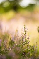 Macrofotografie van een struikje bloeiende heide in de schaduw met zonneschijn op de achtergrond