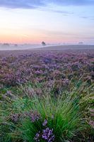 Bloeiende heide bij de Renderklippen op de Veluwe tijdens zonsopkomst. Mist stijgt op vanaf de grond bij de eerste zonnestralen aan het begin van deze zomerse dag in augustus.