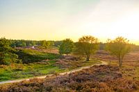 Bloeiende heide planten op de Veluwe tijdens zonsondergang na een warme dag in de zomer. Een pad kronkelt tussen de heide door richting het bos in de achtergrond.