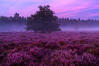 Bloeiende heide tijdens de schemering op de Veluwe. Een prachtig laagje mist in de achtergrond en de wolken in de lucht hebben dezelfde mooie kleur als de heide.
