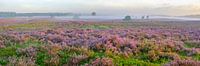 Bloeiende heide tijdens zonsopkomst op de Veluwe met grondmist. De eerste zonnestralen vallen op de heideplanten van dit wijdse panorama.