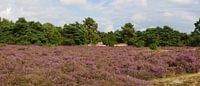 Deze heide struiken zijn wat ouder en de schade van de droge jaren is nog te zien ze zijn behoorlijk warrig. Delen van de struiken zijn afgestorven. De jonge heide die er tussen staat bloei op een later moment. De grove dennen op de achtergrond maken het plaatje compleet.