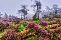 Een mistige ochtend op de bloeiende heide. De golvende lijnen, het kreupelhout de prachtige kleuren en de mysterieuze sfeer maken de foto helemaal af.