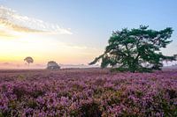 Bloeiende heideplanten in heidelandschap tijdens zonsopgang in de zomer in natuurgebied de Veluwe in Gelderland. Er hangt een beetje mist over de paars en roze bloeiende gewone heide.
