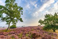 Bloeiende heideplanten in heidelandschap tijdens zonsopgang in de zomer in het Gelderse natuurgebied de Veluwe.
