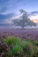 Bloeiende heideplanten (Calluna vulgaris) in heidelandschap met een oude eiken tijdens een vroege ochtend zonsopgang in de zomer in natuurgebied de Veluwe in Gelderland, Nederland.
