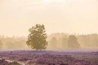 Bloeiende heideplanten in heidelandschap tijdens zonsopgang in de zomer in natuurgebied de Veluwe aan het begin van een mooie warme zomerdag met wat mist over de heide.