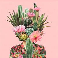 Een surrealistisch samenspel van flora en menselijkheid ontvouwt zich waar cactusachtige planten en mollige bloemen een gezicht omlijsten. De levendige kleurenpracht tegen de zachtroze achtergrond creëert een harmonieuze verbinding met de natuur en duidt op een bloemengeest die zwelgt in een bloeiende fantasiewereld - origineel en…