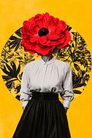 Een stralend, rood bloemhoofdje rijst majestueus op, omringd door een harmonieus samenspel van plantenpatronen en een felgele achtergrond. De eenvoudige elegantie van de witte blouse en zwarte rok contrasteert indrukwekkend met de bloemenpracht die sensualiteit en natuur combineert. Er ontvouwt zich een fascinerend samenspel tussen mens en bloem.