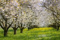 Foto van een bloeiende kersenboomgaard in Duitsland.