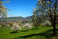 Bloeiende kersenbomen, uitzicht op Obereggenen, Markgräflerland, Zwarte Woud, Baden-Württemberg, Duitsland
