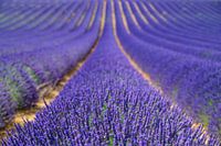 Lavendelbloemen bloeien op het plateau van Valensole in de Provence tijdens een zomerse dag. Dit gebeurt meestal van eind juni tot midden juli, afhankelijk van het weer en de hoogte. De lucht is gevuld met geluiden van zoemende bijen en de geur van lavendel doordringt de lucht. In de buurt groeien gouden tarwevelden die voor een kleurrijk contrast zorgen. Lokale producten zijn lavendelolie, zeep, likeur en honing.