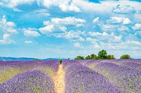 Lavendelbloemen bloeien op het plateau van Valensole in de Povernce tijdens een zomerse dag. Dit gebeurt meestal van eind juni tot half juli, afhankelijk van het weer en de hoogte. De lucht is gevuld met geluiden van zoemende bijen en de geur van lavendel doordringt de lucht. In de buurt groeien gouden tarwevelden die voor een kleurrijk contrast zorgen. Lokale producten zijn lavendelolie, zeep, likeur en honing.