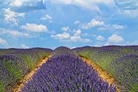 Lavendelbloemen bloeien op het plateau van Valensole in de Povernce tijdens een zomerse dag. Dit gebeurt meestal van eind juni tot half juli, afhankelijk van het weer en de hoogte. De lucht is gevuld met geluiden van zoemende bijen en de geur van lavendel doordringt de lucht. In de buurt groeien gouden tarwevelden die voor een kleurrijk contrast zorgen. Lokale producten zijn lavendelolie, zeep, likeur en honing.