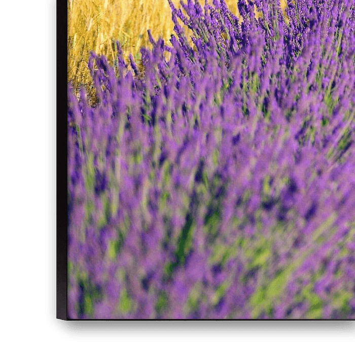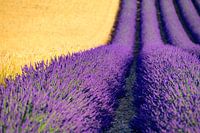 Lavendelbloemen bloeien op het plateau van Valensole in de Provence tijdens een zomerse dag. Dit gebeurt meestal van eind juni tot midden juli, afhankelijk van het weer en de hoogte. De lucht is gevuld met geluiden van zoemende bijen en de geur van lavendel doordringt de lucht. In de buurt groeien gouden tarwevelden die voor een kleurrijk contrast zorgen. Lokale producten zijn lavendelolie, zeep, likeur en honing.