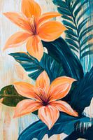 Een stralend samenspel van oranje lelies en diepgroene bladeren ontvouwt zich in een harmonieuze symfonie van kleur. De levendige compositie creëert een frisse, uitnodigende sfeer en fleurt elke kamer op. Dit kunstwerk is ideaal voor de keuken of woonkamer en creëert een bloeiende oase van inspiratie en levensvreugde.