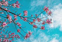 Mooie bloeiende magnolias op een mooie lentedag, mooie blauwe hemel achtergond