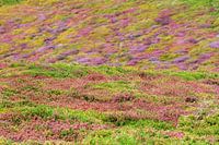 Prachtige opname van Cap Frehel, aan de smaragdkust van Bretagne, Frankrijk, met bloeiende paarse struikhei (Calluna vulgaris) en gele gaspeldoorn (Ulex europaeus) in de zomer