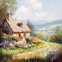 Een betoverend toevluchtsoord omringd door een bloeiende zee van kleur, waar glooiende heuvels in de verte liggen. Het rieten huisje straalt gezelligheid uit terwijl de rook uit de schoorsteen opstijgt naar de heldere hemel. Zonneschijn kust de bloemen die levendig dansen rond het pad, waardoor het tafereel verandert in een…