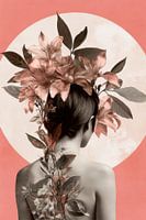 Een zacht maar indrukwekkend schouwspel ontvouwt zich: een teer kind wiens glinsterende rug is versierd met filigraan bloemmotieven. Boven het hoofdje lijken weelderige bloemenelementen omhoog te groeien, terwijl een zachtroze achtergrond een harmonieuze verstilling creëert. Deze samensmelting van mens en natuur straalt gratie en pure schoonheid uit.