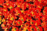 Een close-up van een bloembollenveld met bloeiende rode tulpen.