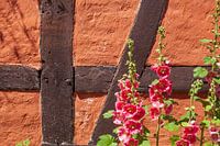 Bloeiende roze stokrozen voor een vakwerkmuur, Duitsland, Europa