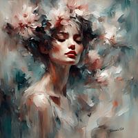 Een vrouw is afgebeeld met een etherische uitstraling, omringd door zachte, bloemachtige vormen die overgaan in haar haar en schouders. Het gebruik van penseelstreken en kleur creëert een droomachtige kwaliteit, die een gevoel van rust en elegantie overbrengt.