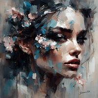 Een opvallend portret van een vrouw is afgebeeld met krachtige penseelstreken en een dynamisch spel van licht en schaduw. Haar blik is opzij gericht, wat een sfeer van contemplatie of introspectie uitstraalt, terwijl geabstraheerde bloemenelementen uit haar haar lijken te bloeien.