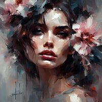 Een close-up portret van een vrouw is afgebeeld met expressieve penseelstreken en een mix van zachte en levendige kleuren. Haar blik is iets opzij gericht, wat een gevoel van introspectie of contemplatie oproept, terwijl bloemige elementen lijken te versmelten met haar haar en de achtergrond.