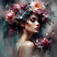 Een vrouw met opvallende gelaatstrekken is getooid met een weelderige krans van roze en witte bloemen. Haar ogen zijn gesloten en ze lijkt sereen of contemplatief, tegen een achtergrond die lijkt op te gaan in het bloemstuk.