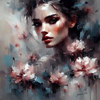 Een opvallende visuele compositie mengt abstracte bloemenelementen met een zeer gestileerd vrouwenportret. Vette contrasten en dramatische penseelstreken benadrukken de intense blik en opvallende rode lippen van de geportretteerde.
