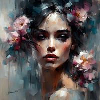 Een portret van een vrouw met een dromerige uitdrukking is afgebeeld met expressieve penseelstreken in een moderne impressionistische stijl. Haar haar lijkt door de wind te zijn verwaaid, vermengd met levendige bloemen die een vleugje kleur aan de compositie toevoegen.