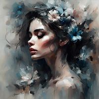 Een prachtig portret van een vrouw met donker haar versierd met blauwe bloemen is vastgelegd in een mix van scherpe en diffuse penseelstreken. Haar ogen zijn gesloten en ze lijkt in een rustige staat, met zachte verlichting die haar gelaatstrekken en de bloemen in haar haar accentueert.