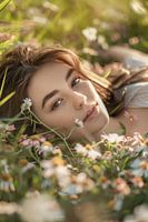 De foto toont een jonge vrouw die vredig in een bloeiende weide ligt. Omringd door tere bloemen straalt haar gezicht zachtheid en gratie uit. De warme zonnestralen benadrukken haar stralende ogen en de natuurlijkheid van de scène, terwijl de zachte kleuren een harmonieuze en dromerige sfeer creëren.