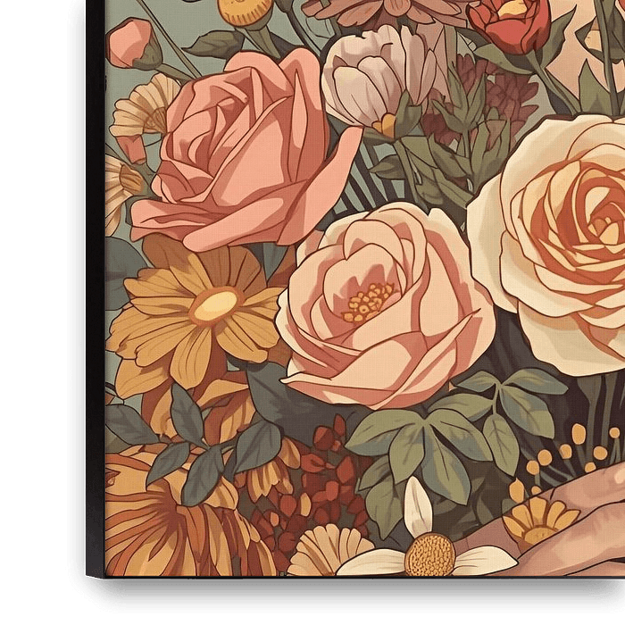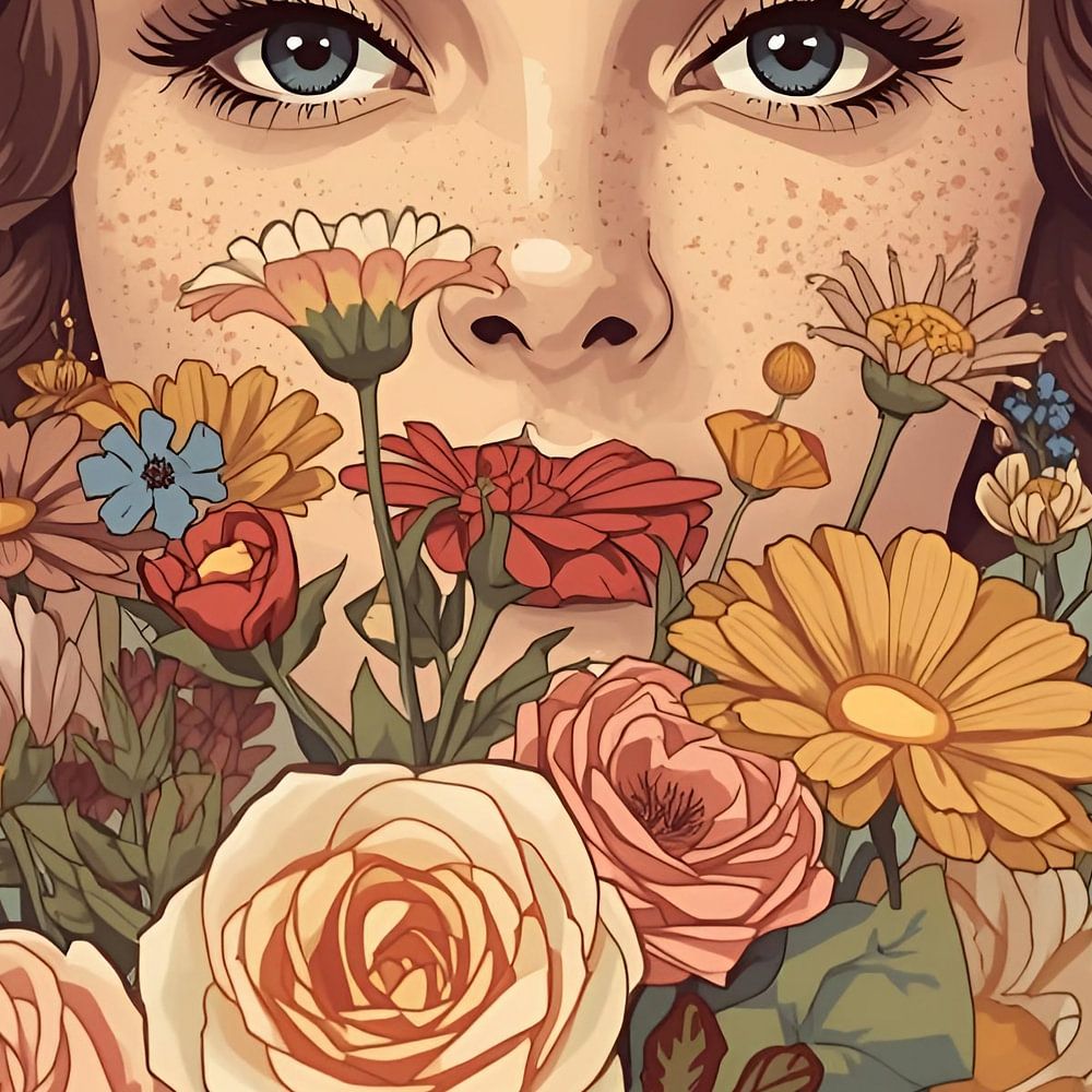boeiend vintage portret dat de geest van een bloeiende stilte vastlegt. Het kunstwerk toont een mooie vrouw met een klassiek pin-up kapsel en een levendige rode bandana, omlijst door een overvloedig boeket van diverse bloemen, waaronder zachtroze en gele rozen, madeliefjes en goudsbloemen. Haar blik is direct en expressief, aangevuld…