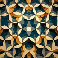 Dit elegante kunstwerk heeft een naadloze mix van geometrische patronen en bloemmotieven, gerangschikt in een evenwichtige, symmetrische compositie. Een kleurenpalet van zacht blauw, warm grijs en goudgeel zorgt voor een uitnodigende en verfijnde visuele ervaring. De op bloemen geïnspireerde vormen voegen een natuurlijk tintje toe aan het getextureerde ontwerp en zijn perfect voor moderne interieurs, textiel of verfijnde decoratieve accenten.