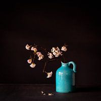 Stilleven met met tak met roze bloemetjes in een blauwe vaas met donkere achtergrond