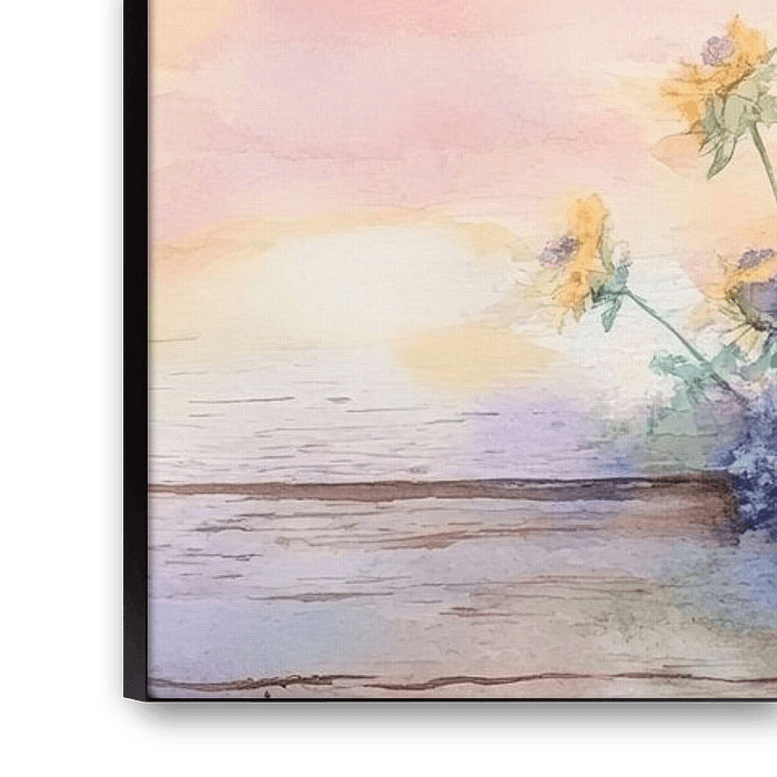 Stralende zonnebloemen dansen in het zonlicht, omlijst door delicate lavendelbloesems en zachte kleurtinten. Deze bloemige compositie straalt levensvreugde en frisheid uit, perfect voor een keuken of eetkamer, waar het het dagelijkse leven verrijkt met een vleugje natuur en kleur. Een zomerse droom die elk hart verwarmt!