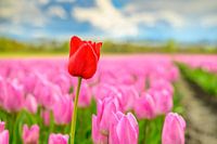 Kleurrijke bloeiende tulpenbloemen in een veld omringd door bomen tijdens de lente met stormachtige wolken erboven. Het bloembollenveld ligt in Drenthe, een minder bekend gebied voor tulpenvelden.