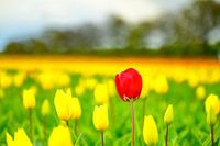 Kleurrijke bloeiende gele tulpenbloemen met één rode tulp in een veld omringd door bomen in de lente met stormachtige wolken erboven. Het bloembollenveld ligt in Drenthe, een minder bekend gebied voor tulpenvelden.